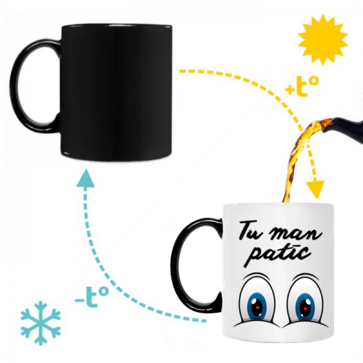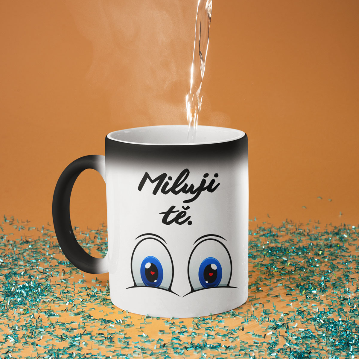 - Magiczny kubek – nie bez powodu nazywany jest magicznym! Na pierwszy rzut oka wygląda jak zwykły czarny kubek, ale po napełnieniu gorącą wodą zmienia kolor na biały i ujawnia ukryty nadruk. To prawdziwa niespodzianka oraz mały cud na każdy dzień!