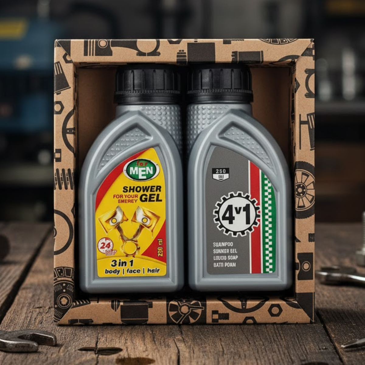 Opakowania żelu pod prysznic i szamponu wyglądają jak butelki smaru samochodowego, więc ten zestaw jest idealny dla mężczyzn, którzy nie tylko lubią dbać o swoje ciało, ale także cenią sobie dowcipne i praktyczne prezenty.